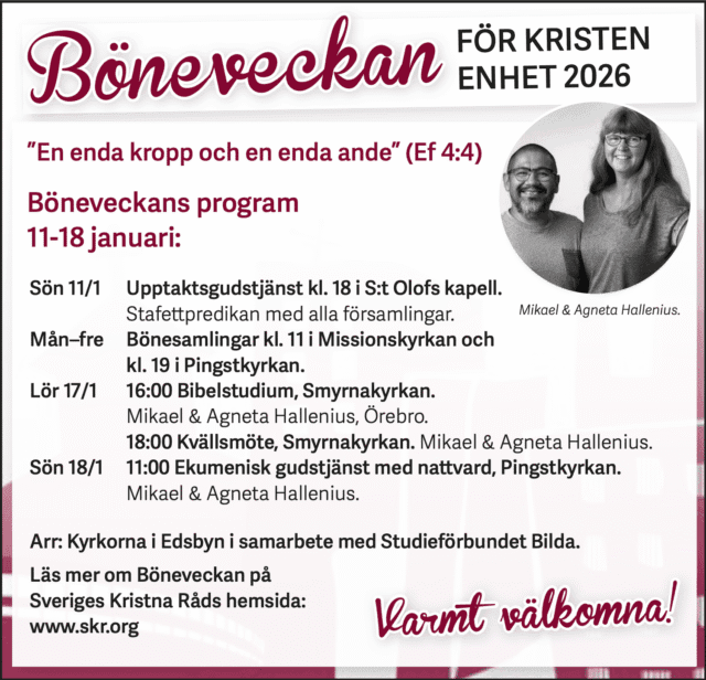 Böneveckan för kristen enhet är världens största ekumeniska manifestation som genomförs samtidigt i cirka 120 länder. Den infaller 18-25 januari, alltid samma datum varje år. Det är möjligt att göra lokala anpassningar, varför kyrkorna i Edsbyn av tradition firar böneveckan söndag–söndag, detta år 11–18 januari. Temat för i år...
