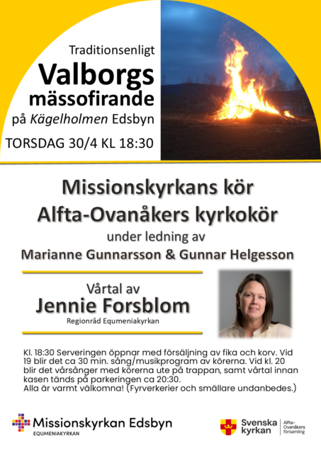 Alla är varmt välkomna till valborgsfirande på Kägelholmen! 🔥🎶🌭🍪☕ Det blir servering av korv, fika och kaffe; sångprogram av körerna från Alfta-Ovanåkers församling och Missionskyrkan både inne och ute; vårtal av Jennie Forsblom, regionråd; och så hoppas vi förstås få till en härlig kase! Till det senare tar vi...