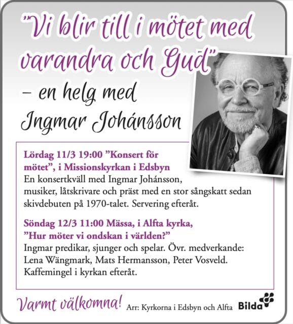 Helgen 11–12/3 gästas vi i Edsbyn och Alfta av Ingmar Johánsson under rubriken "Vi blir till i mötet med varandra och Gud". Välkommen till lördagens konsertkväll med Ingmar Johánsson, musiker, låtskrivare och präst med en stor sångskatt sedan skivdebuten på 1970-talet. Servering efteråt. Söndagen firas mässa i Alfta kyrka...